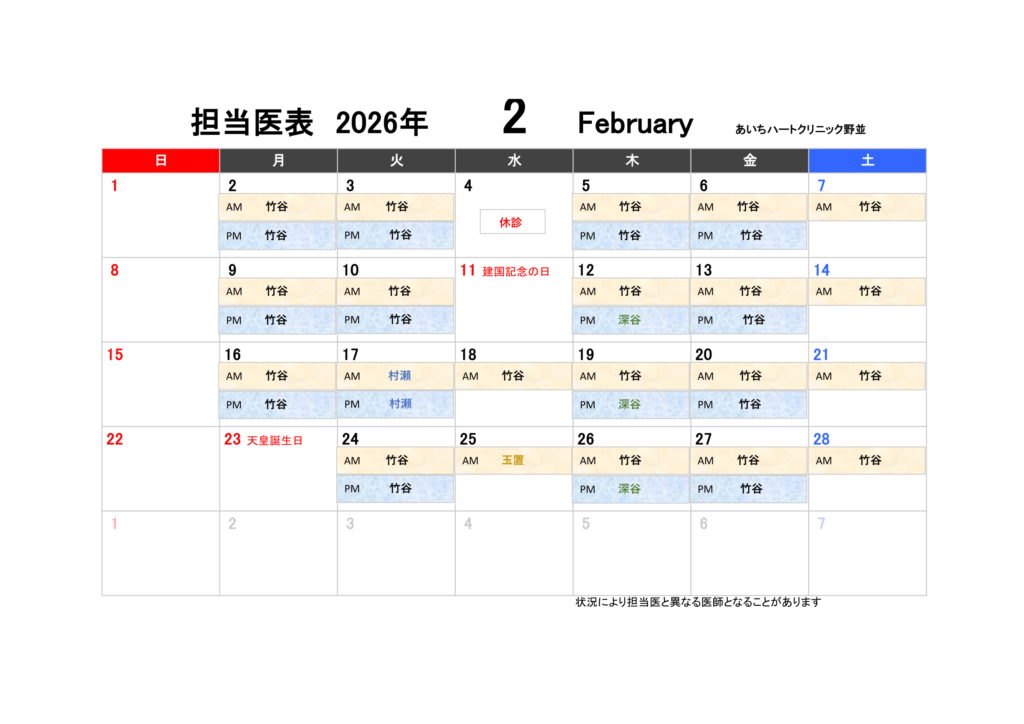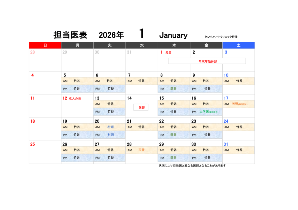 担当医表 2026年1月~3月